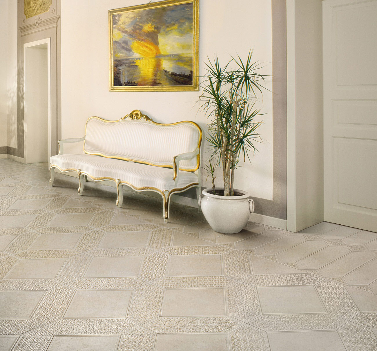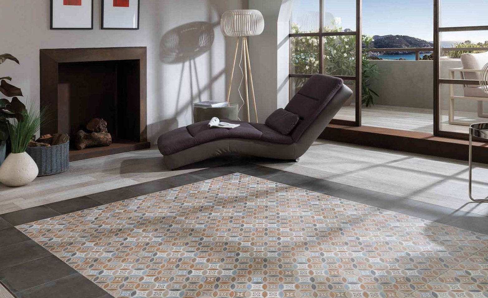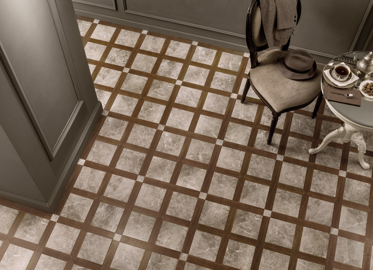 Diese Art von Feinsteinzeug ist mit natürlichen Substanzen gefärbt, daher sind einfarbige Elemente ziemlich teuer. Sie sind in Form von verschiedenen Mustern und abstrakten Mustern auf dem Boden angeordnet, das können geometrische Drucke oder im Schachbrettmuster angeordnete Beläge sein.