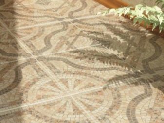Die Bodenfläche kann mit mehreren hundert mehrfarbigen Fliesen beschnitten werden, wodurch eine interessante Palette entsteht. Verwenden Sie gleichzeitig verschiedene Arten einer Kombination. Mosaic Stoneware Fliesen sind in Form von abstrakten Mustern sowie geometrische Ornamente und Formen gelegt.