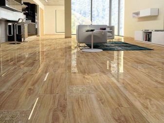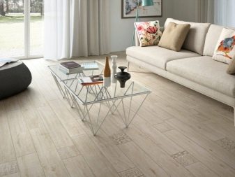 Darüber hinaus ist es üblich, solche Beschichtungen in Studios zu verwenden, die in verschiedene Funktionsbereiche unterteilt sind. Dort können Sie gleichzeitig eine Kachel unter den Baum legen und einen Naturholzboden oder Laminatboden verlegen.Darüber hinaus sind viele Hersteller großformatige Steinzeug-Holzmaserungsfliesen, die ein Muster aus Mini-Elementen aufweisen. Dies können Modelle für den Weihnachtsbaum, große Platten für das Brett oder Gegenstände mit einem Muster für das Deck sein.