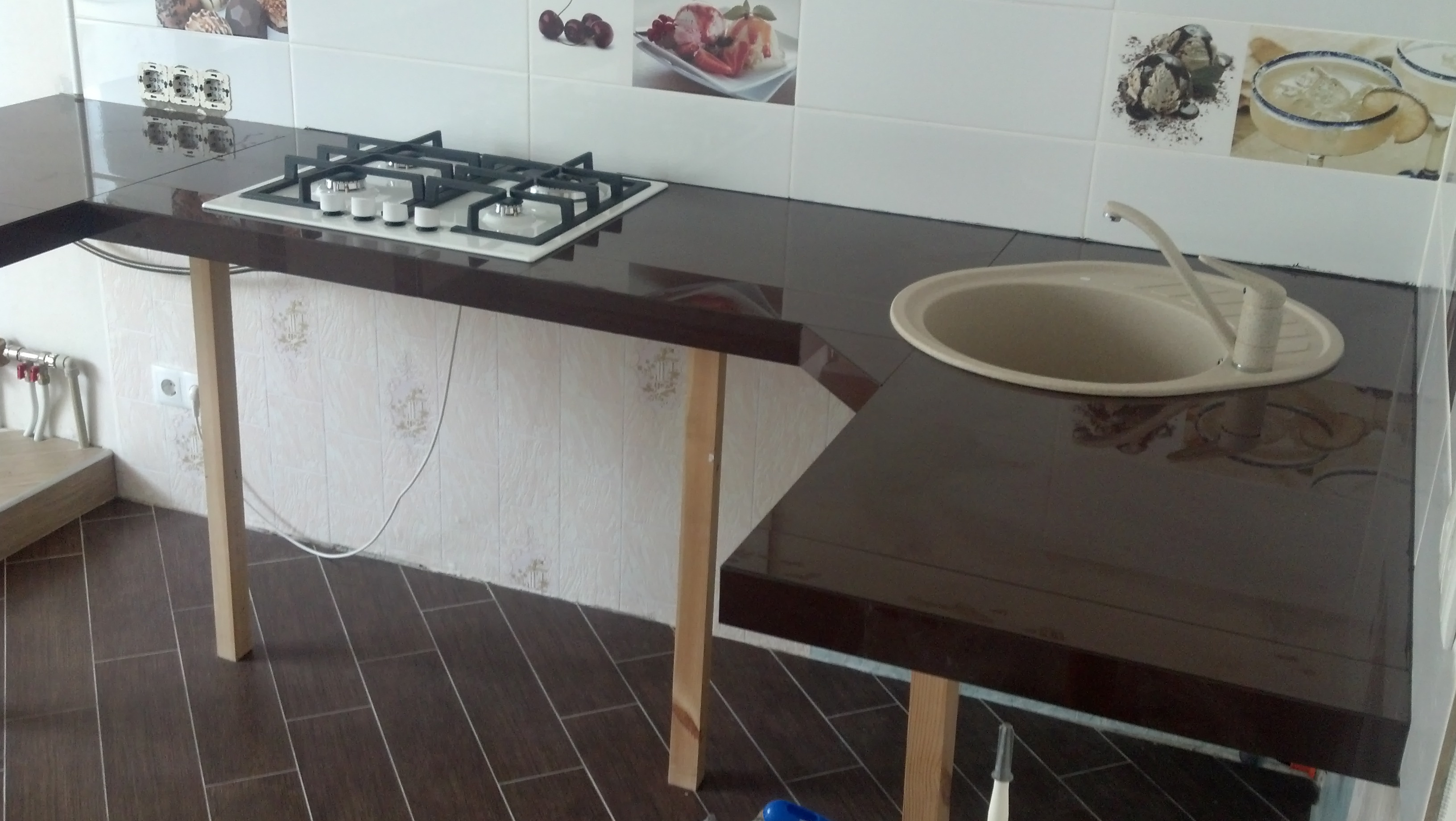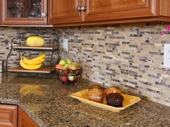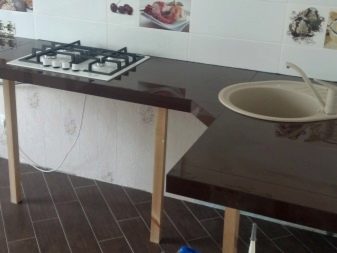Auf einer solchen Tischplatte können auch heiße Pfannen und Töpfe gestellt werden. In diesem Fall absorbiert die Tischplatte weder Geruch noch Schmutz noch Fett. Diese Beschichtung ist auch leicht zu reinigen.Um dies zu tun, erwerben meist eine glatte Steingutfliesen.