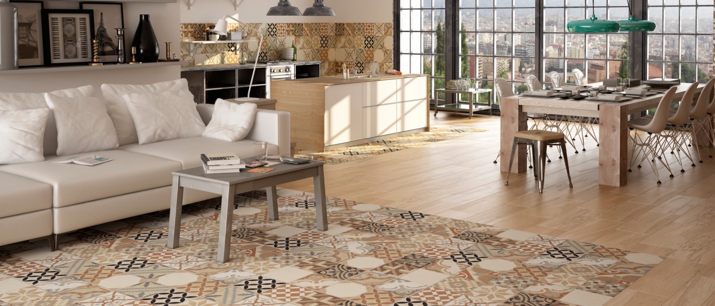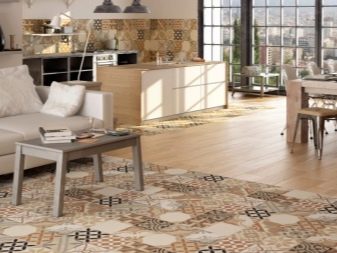 Im großen Wohnzimmer kann die Küche mit solchen Fliesen ausgelegt werden, und der Essbereich und der Sitzbereich mit einem Sofa können mit Naturholz oder sogar Teppich dekoriert werden.