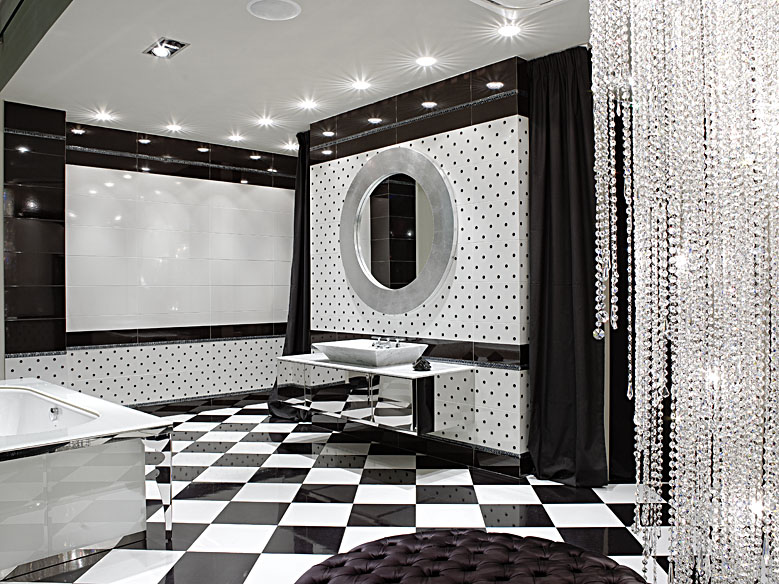 In Räumen mit hellerem Innenraum, zum Beispiel im Badezimmer oder in der Küche, können Sie den Einfarbigen verwenden. Solche Modelle aus Feinsteinzeug schaffen ein eingängiges und stilvolles Design. Darüber hinaus ist es auf diese Weise möglich, schwarz-weiße Elemente in einem Schachbrettmuster für ein zurückhaltenderes und strengeres Design auszulegen.