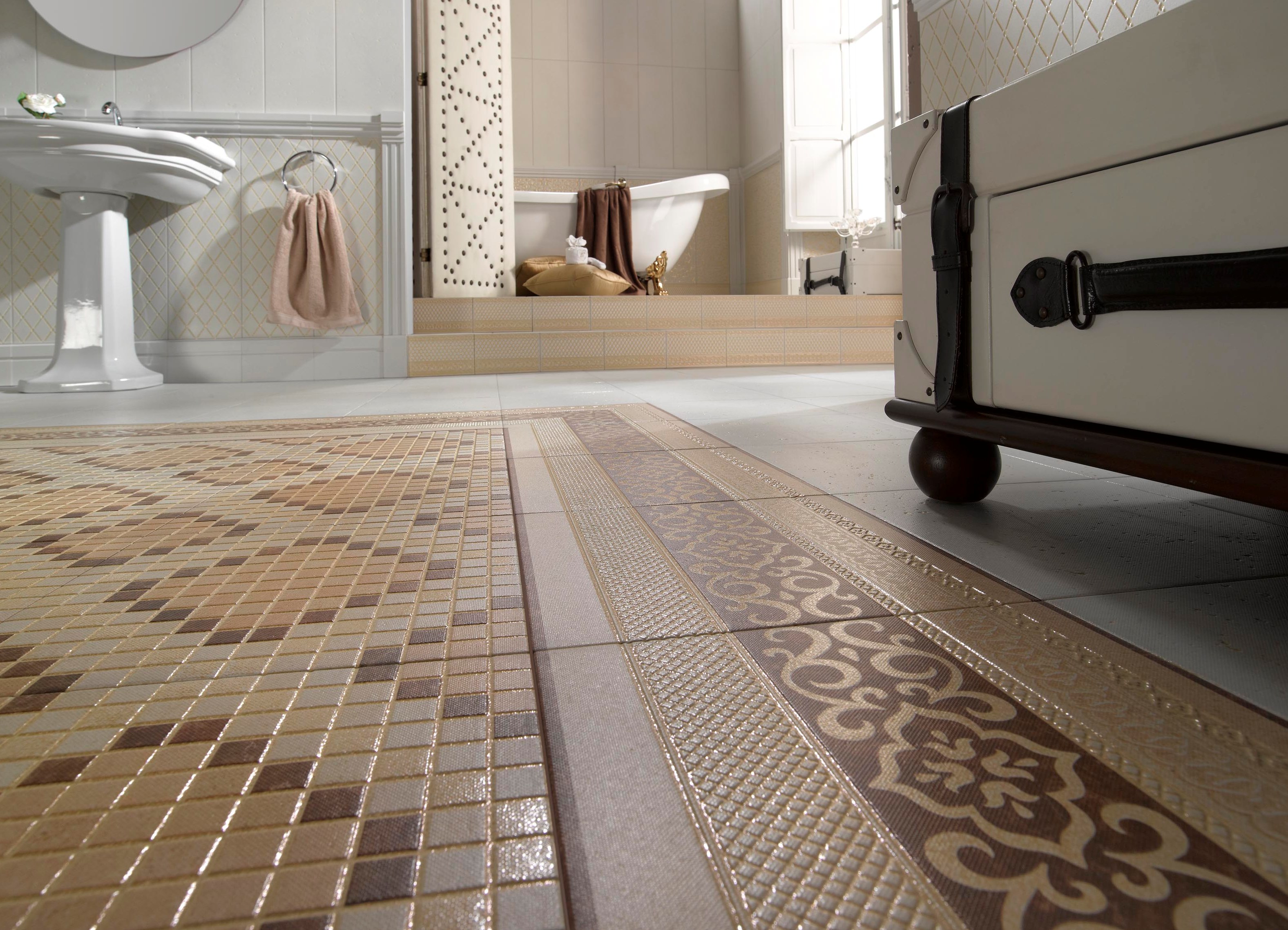 Der Schachplan und das Legen in Form von vorgefertigten Verzierungen ist ebenfalls beliebt. Zur gleichen Zeit, Mosaik Feinsteinzeug ist für fast jeden Stil geeignet und sieht vorzeigbar.