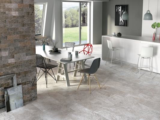 Diese Art von Feinsteinzeug hat eine interessante Textur. Die Produkte werden satiniert, wodurch der visuelle Effekt der matten und semi-archite Fliesenoberfläche erreicht wird. Wenn die obere Schicht mit Mineralsalzen beendet wird.