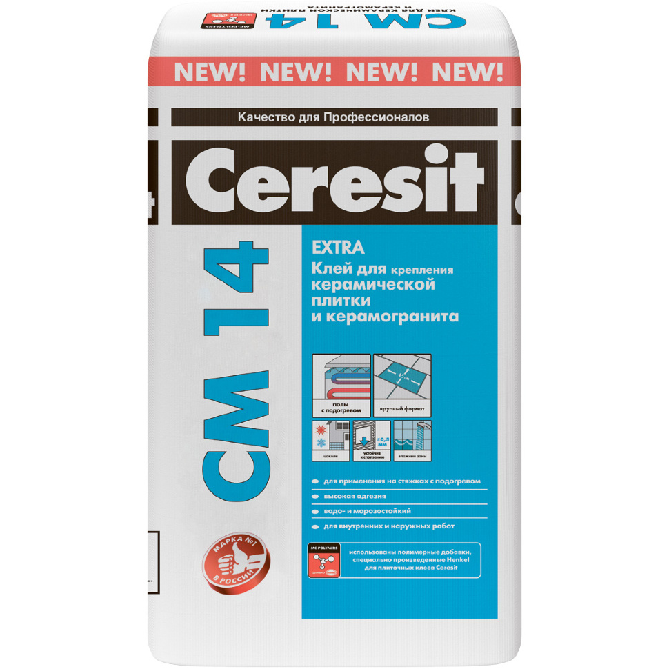 Zusammensetzung mit einer Zementbasis, verstärkt mit speziellen Zusätzen. Entwickelt für die Arbeit mit Keramik, Keramik-Granit-Platten auf Zementbasis mit Parametern bis zu 450x450 mm an Wänden und Böden bei der Arbeit im Inneren, einschließlich an Orten mit übermäßigen Hydroindikatoren, auf warmen Böden, Vorderflächen von Gebäuden, resistent gegen Verformungen von Beton und Zementfundamenten. Der Kleber SM-14 ist elastisch, hat eine hohe Haftung, ist wasser- und frostbeständig, rutschfest und in Verbindung mit der Imprägnierung.