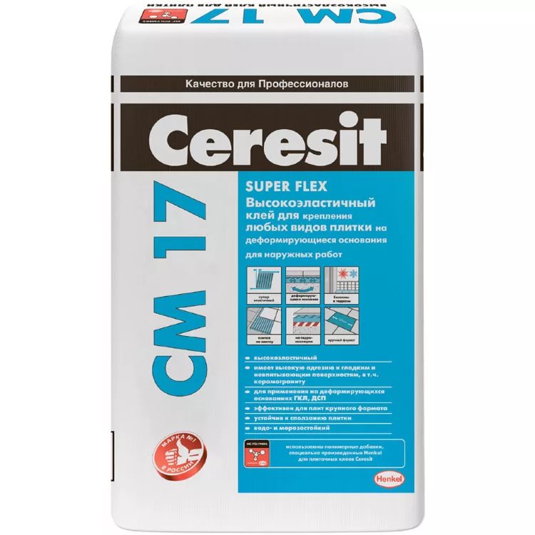 Masters geben überwiegend positives Feedback zu Klebstoffgemischen der Marke Ceresit. In diesem Fall wird eine Änderung vorgenommen, dass CM 11 für die Außen- und Innenbearbeitung auf Böden ohne Heizung verwendet wird. Es ist notwendig, CM 117 für Fußbodenheizung und CM 17 für Schwimmbecken zu verwenden.Ceresit CM 14 Kleber für Feinsteinzeug härtet schnell aus, so dass das Verfugen nach 3 Stunden erfolgen kann.