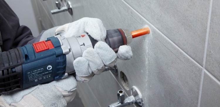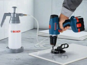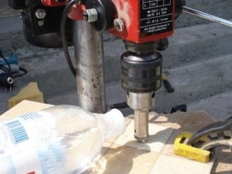 Innerhalb der Bohrer, die für solche Bohrungen ausgelegt sind, befindet sich Olivenöl. Zu Beginn der Arbeit ist es notwendig, den Bohrer nicht im rechten Winkel zu halten. Es ist notwendig, das Werkzeug mit einem bereits rotierenden Bohrer auf die behandelte Oberfläche zu bringen. Dies ist notwendig, um die Fliesenoberfläche nicht zu beschädigen.
