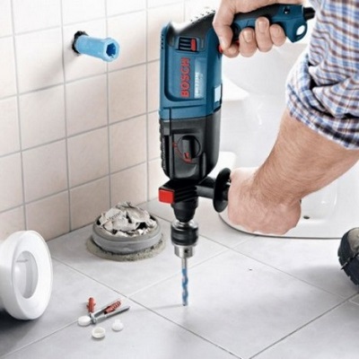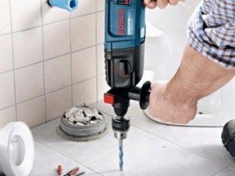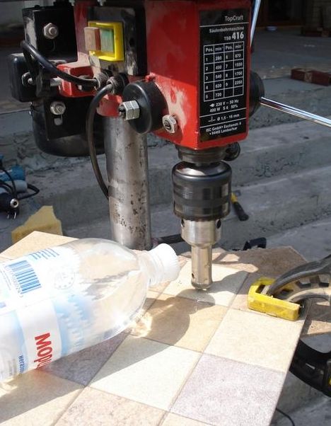 Um ein Loch für die Toilettenhalterung in der Keramik Granitfliese bereits auf dem Boden zu machen, ist es notwendig, eine Diamantkrone zu verwenden. Normalerweise ist es eine Krone D 10 mm, die mit Wasser verwendet werden sollte.
