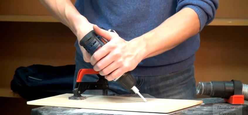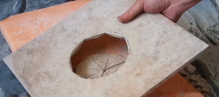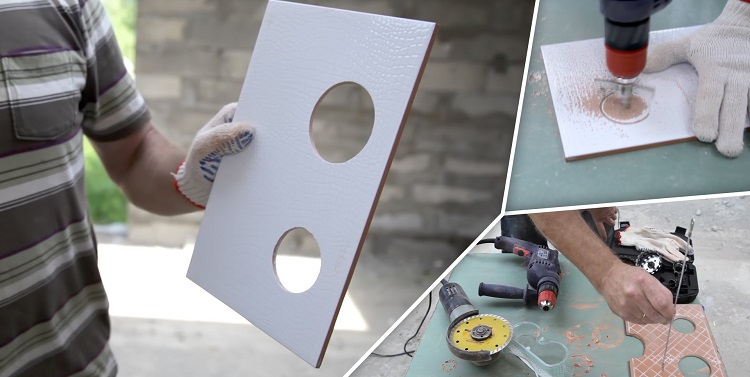 Bevor Sie mit dem Bohren beginnen, vergessen Sie nicht, DVP oder Sperrholzplatten unter das Feinsteinzeug zu legen, um nicht versehentlich die Oberfläche des Bodens oder des Tisches mit einem Bohrer zu beschädigen. Der Bohrer sollte nur vertikal ausgerichtet sein, es sollte keine zu starke Neigung zur Platte zugelassen werden.