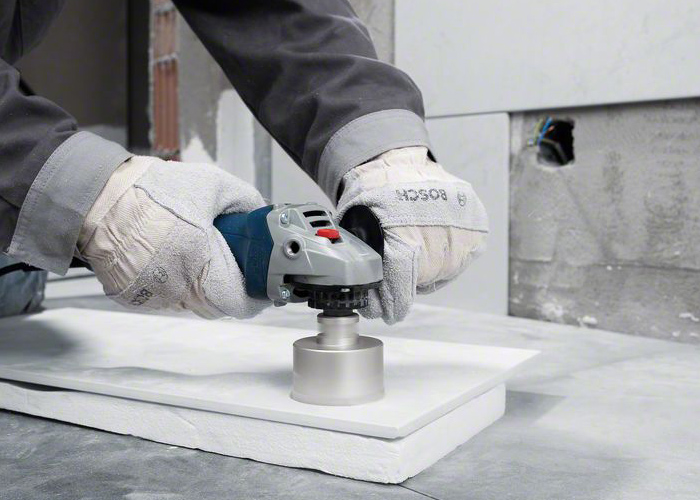 Es wird empfohlen, ein Loch für die Diele zu machen, bevor die Fliese verlegt wird. Auf der Vorderseite der Keramikfliese ist eine Markierung angebracht,Eine Markierung wird mit einem Bohrer mit kleinem Durchmesser in der Mitte des beabsichtigten Lochs angebracht. Dann wird eine Diamantkrone mit großem Durchmesser genommen, die für die Installation der Fassung notwendig ist. Dann wird der keramische Granit durchgebohrt.