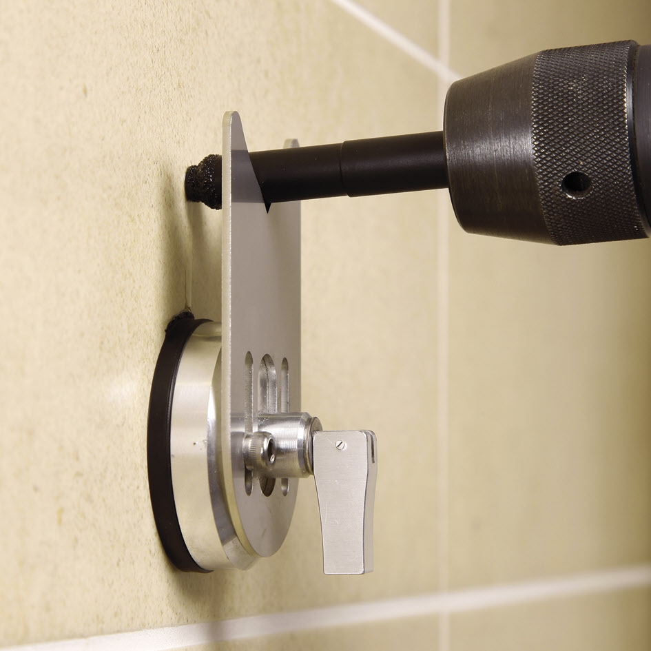 Dann müssen Sie eine Markierung auf dem Porzellan machen. Richten Sie diese Markierung auf das Loch in der Schablone aus und beginnen Sie mit dem Bohren. Nach einiger Zeit können Sie die Schablone entfernen und ohne sie weiterarbeiten. Nachdem die Keramikgranitplatte bis zum Ende gebohrt wurde, ist es möglich, die Diamantkrone durch einen gewöhnlichen Bohrer zu ersetzen und ein Loch zum Befestigen der Toilettenschüssel damit zu bohren.