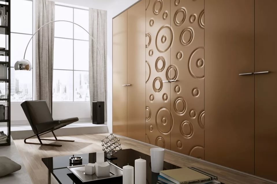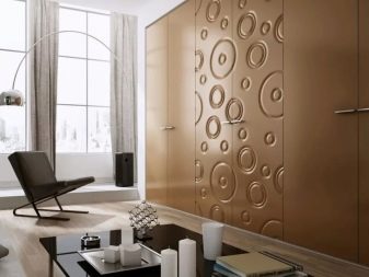 3D-MDF-Platten können verschiedene Texturen und Drucke aufweisen und nicht nur die Wände, sondern auch die Decke, Trennwände und sogar Möbel dekorieren. Im Gegensatz zu herkömmlichen Gipskartonplatten können innovative Möbel mit dreidimensionaler Wirkung beispielsweise Möbel oder Innentüren schmücken. Da die Paneele aus natürlichen Materialien bestehen und keine Gefahr für die Gesundheit darstellen, können Sie diese mit Wohnräumen ausstatten, in denen wir maximal freie Zeit verbringen - zum Beispiel im Wohnzimmer, Schlafzimmer oder Kinderzimmer.Obwohl Experten die Besitzer davor warnen, dass einige Ornamente die Augen ermüden könnten, ist es daher ratsam, vorsichtig mit der Wahl der Textur zu beginnen.