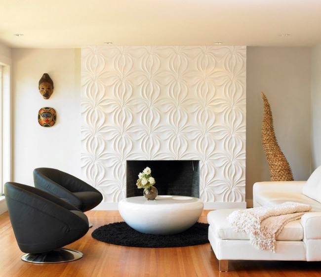 Sie können das Panel für Zoneneinteilungen verwenden. Aber auch eine spektakuläre Design-Technik ist die Schaffung von Reliefzonen an den Wänden, um ein modernes Interieur zu schaffen. Zum Beispiel können Sie solche Schornstein Zonen oder Bereiche, die Sie im Raum zuweisen möchten. 3D-Platten aus MDF können sowohl die gesamte Wand als auch deren Teile abdecken. So kann beispielsweise im Hintergrund der Sofazone eine volumetrische Wandverkleidung erstellt werden oder im Wohnzimmer ein Bartresen angeordnet werden.