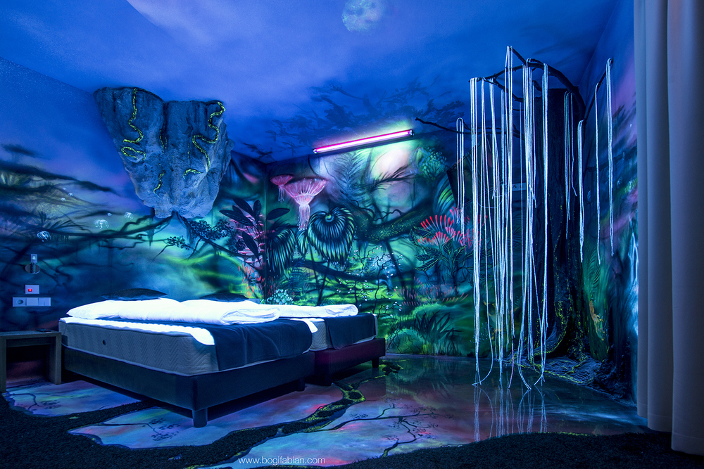 3D-Paneele aus MDF mit einer speziellen fluoreszierenden Beschichtung können in der Nacht ein schwaches Leuchten (in der Regel ein blau-grüner Farbton) abgeben, was die ungewöhnliche Textur eines modernen Veredelungsmaterials unterstreicht. Dieser Effekt kann bis zu 10 Stunden dauern. Solche Paneele sind übrigens absolut sicher für den Menschen und handeln nach dem Prinzip, dass sie tagsüber Lichtenergie akkumulieren und nachts "verschenken".