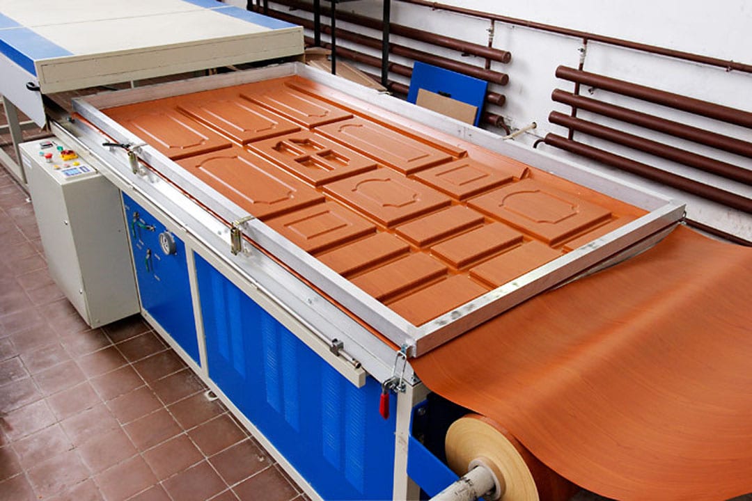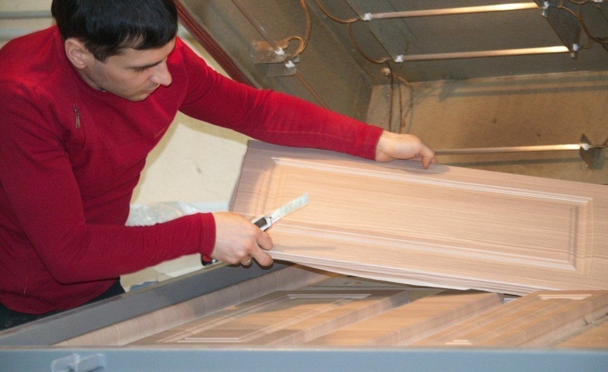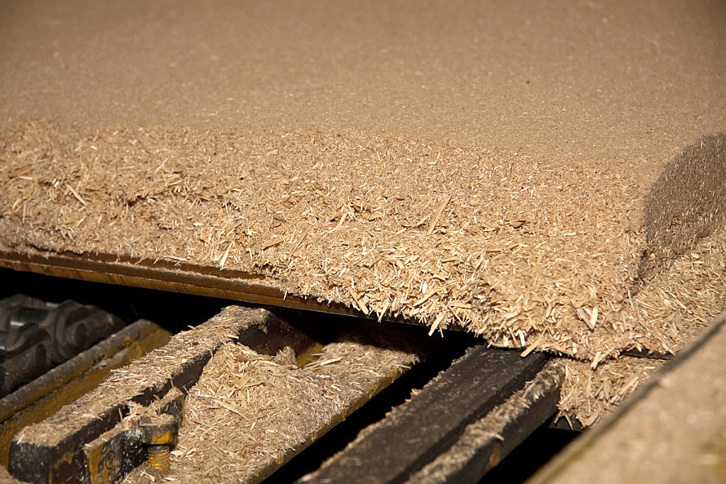 - Die Bildung von Platten. Die vorbereiteten Komponenten werden zum Trocknen geschickt, um Restluft zu entfernen, und dann in spezielle Formanlagen geladen. Nachdem sich ein Blatt der gewünschten Breite mit den Kanten bereits getrimmt hat.