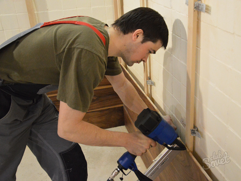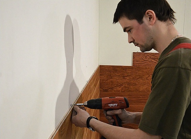 - Die kompetente Installation beginnt in der unteren Ecke des Produkts. Ferner wird das Verfahren zum Befestigen von MDF in der Richtung fortgesetzt, bis es anhält. Die folgenden Zeilen sind auf die gleiche Weise gestapelt.