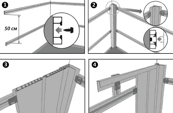 - Befestigungen der Schienen selbst an den Wänden werden mit Schrauben oder Dübeln mit einem Abstand von 400 mm hergestellt;