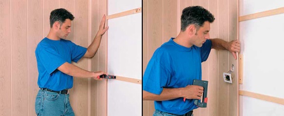 Es ist wichtig zu beachten, dass die horizontalen Rahmen in einer vertikalen Ebene, vertikal - horizontal montiert werden sollten. Wenn es notwendig ist, die Paneele an unebene Wände zu hängen, wird die Kiste über Holzkeile montiert. Die Drähte entlang der Wände verstecken sich unter der Verkleidung.