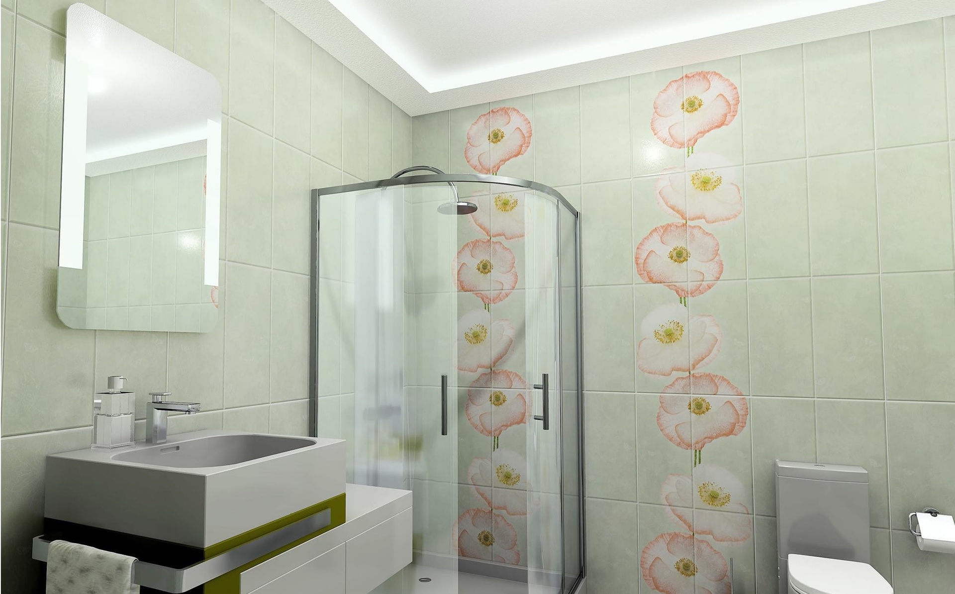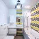 Helle Badezimmer in Grün- und Gelbtönen sehen ebenfalls sehr interessant aus. Wenn Sie diese gesättigten Farben mögen, wählen Sie ein natürliches Thema. Gut geeignete Früchte, Bäume, Vögel, Bilder von tropischen Tieren. Eine große Ladung von Lebhaftigkeit und positiver Stimmung wird Orangen- und Pfirsichpanels geben. Aber eine romantisch gesinnte Natur wäre eine gute Idee, rosa Paneele mit Bildern von Blumen, wie Seerosen, zu installieren.