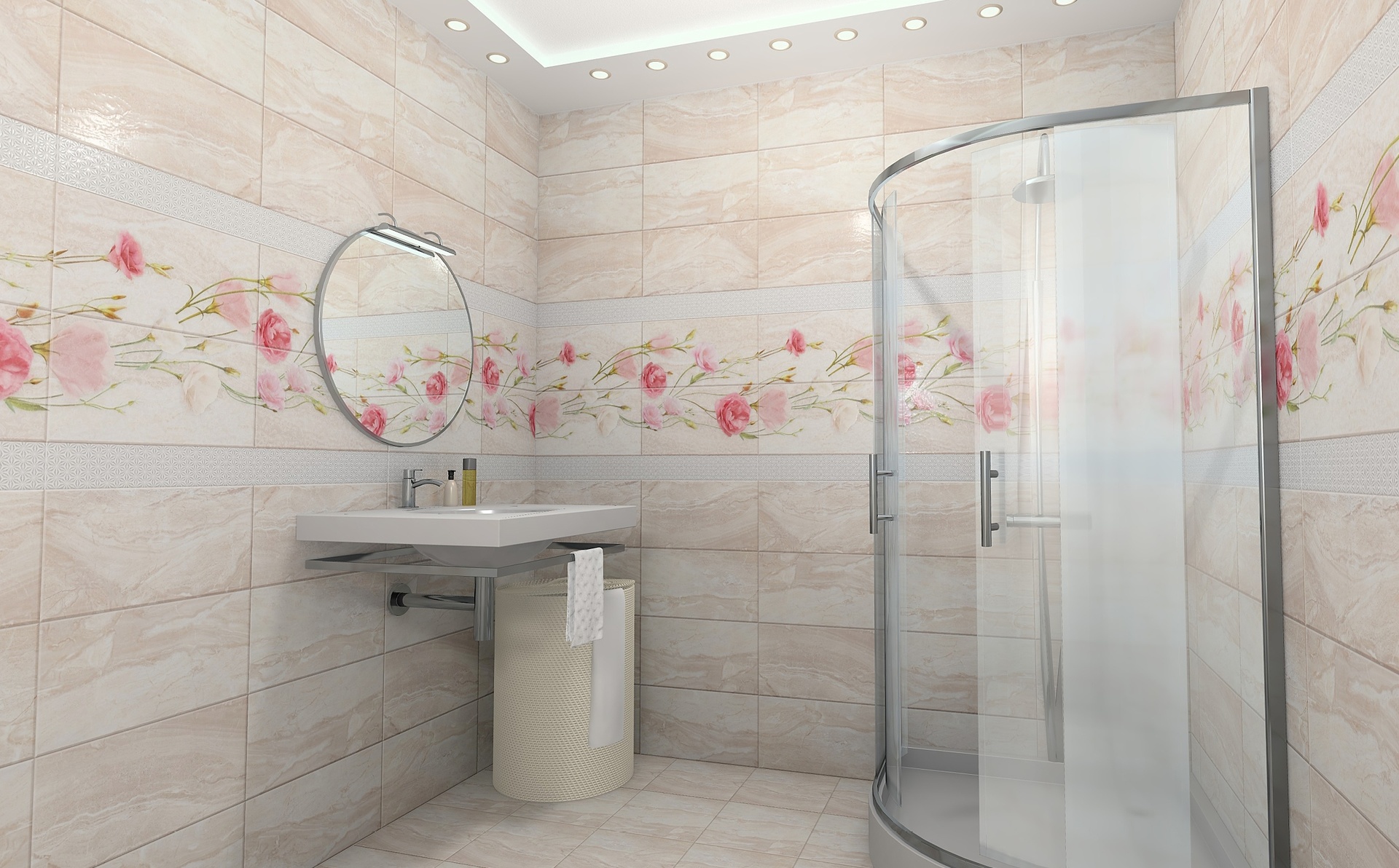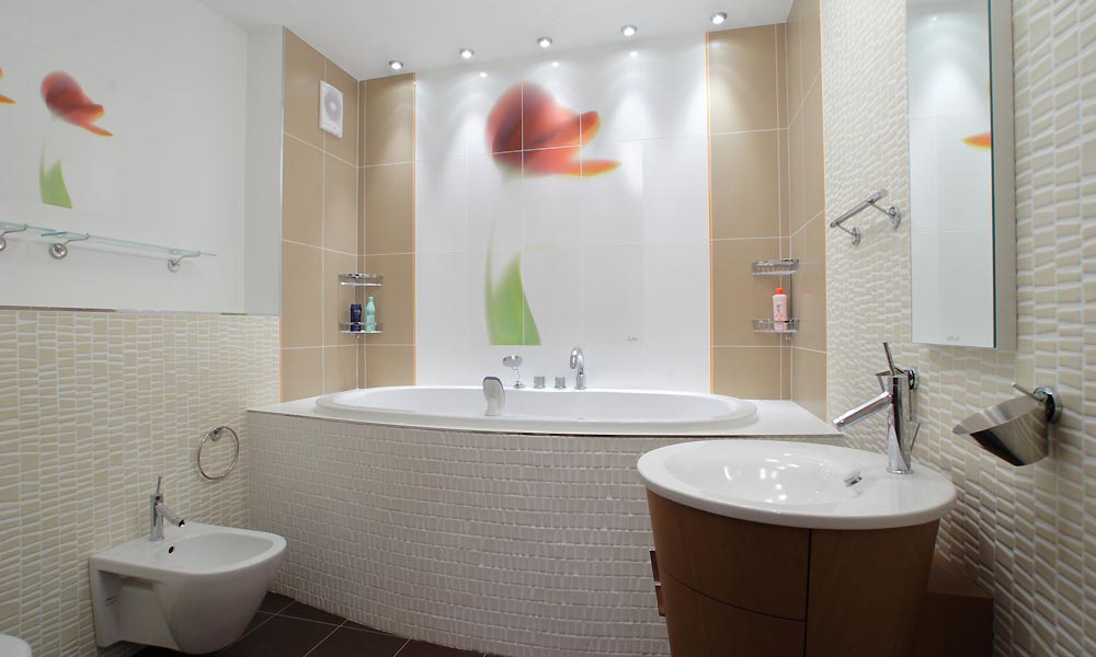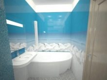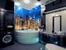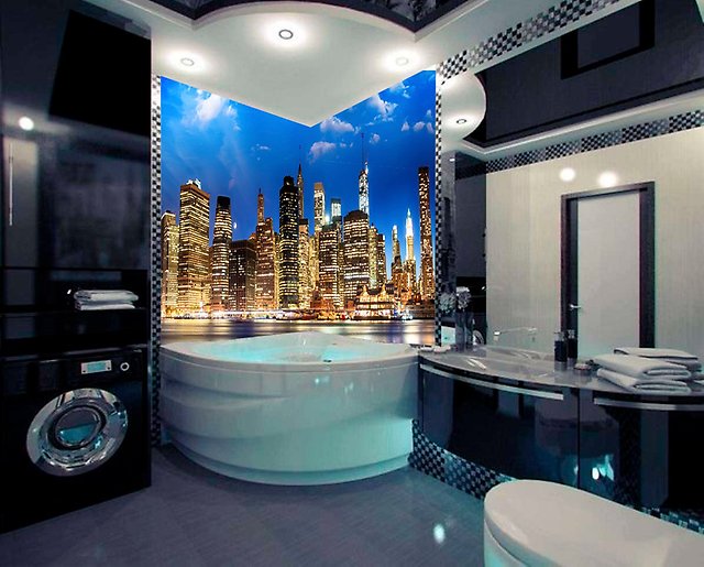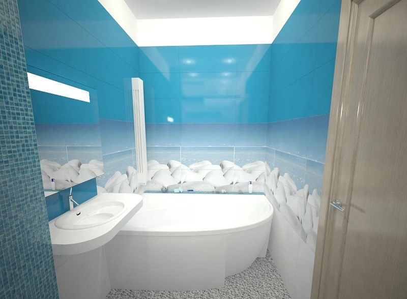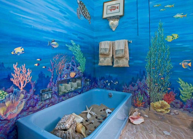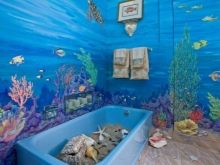 Volumetrische, schöne Zeichnungen an den Wänden sind immer ungewöhnlich und vorzeigbar. Solche Bilder erlauben es nicht nur, den Raum visuell zu vergrößern, sondern auch originell in verschiedenen Beleuchtungen zu erscheinen. Die gute Nachricht ist, dass es bei der Wahl des Musters keine Einschränkungen gibt. Eine große Bandbreite erlaubt es tatsächlich, der Fantasie freien Lauf zu lassen.Zum Auskleiden des Badezimmers eignen sich am besten Zeichnungen, die sich auf Wasser beziehen. Dieses kann ein Marinethema, das Bild der hellen tropischen Fische, der Wassertröpfchen, der Korallen, des sandigen Strandes sein.