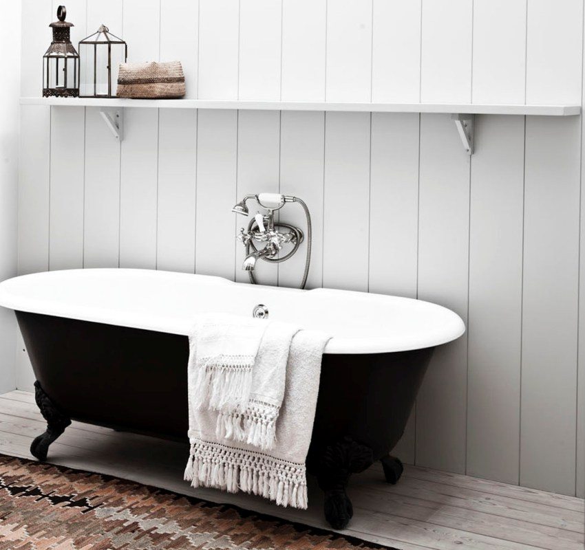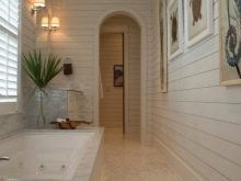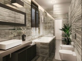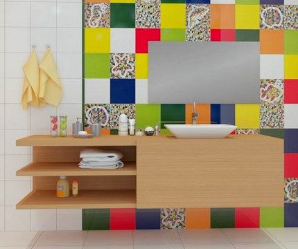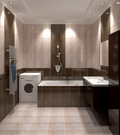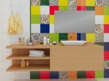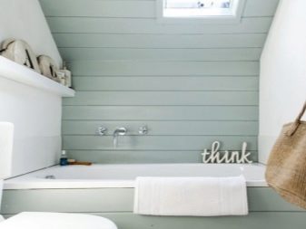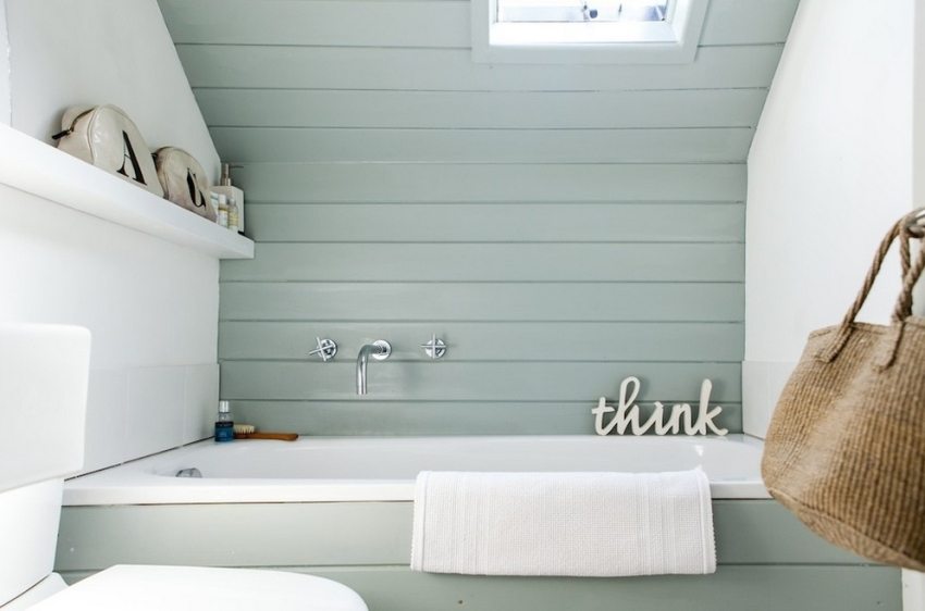 - Weit verbreitete Rezeption der Kombination von Abschlussmaterialien. Kunststoffplatten können zusammen mit Gips und Email in verschiedenen Farben verwendet werden. Wände können mit schmalen Laken dekoriert werden und die restliche Fläche mit feuchtigkeitsbeständiger Farbe gestrichen werden.
