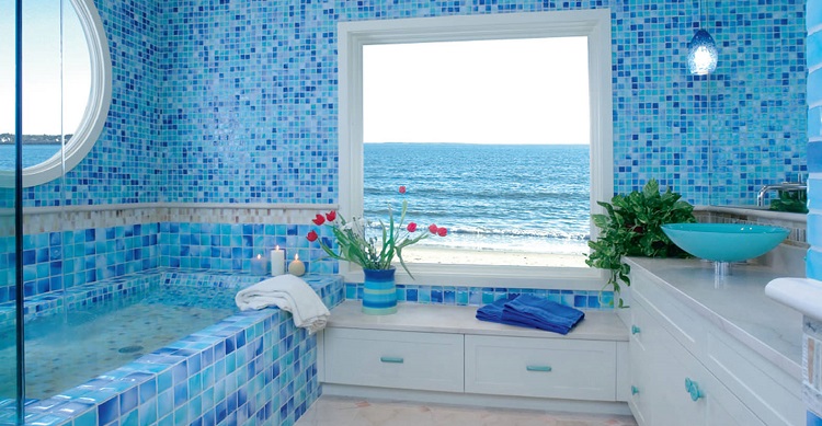 Um ein Dekor im mediterranen Stil zu schaffen, erwerben sie ein Oberflächenmaterial, das ein Mosaik in verschiedenen Größen nachahmt. Die Hauptfarben dieser stilistischen Richtung: Blautöne, Weiß, Türkis.