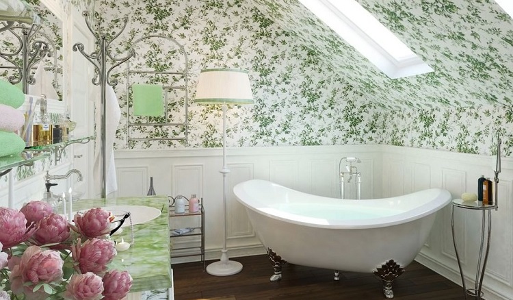 Die Einrichtung im französischen Stil Provence schafft eine Atmosphäre der Ruhe, Leichtigkeit und Komfort im Raum. Wenden Sie Paneele in den Pastellfarben für die Vollenden an: beige, lila, hellrosa, blau und andere Wahlen. Pflichtelement des Dekors - Blumendruck. Es kann Plastikplanen, Vorhänge oder andere Gegenstände im Badezimmer dekorieren.