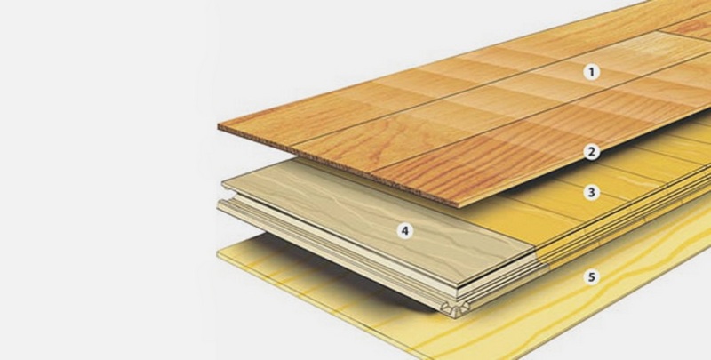 - Abschlussschicht. Es ist aus wertvollen Holzarten hergestellt. Dieses Holz erzeugt ein Muster, das wir auf dem Boden sehen.