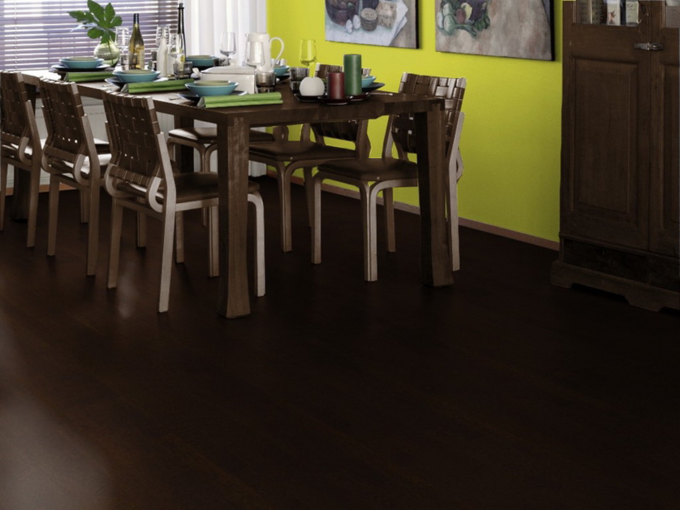 Shamal Eiche. Es ist auch Eichenparkett, das einen dunklen Schatten und eine interessante Farbgebung des Holzmusters hat, die stark kontrastiert, den Streifen über die gesamte Länge der Planke dehnend. Es hat auch keine mit Acryllack überzogene Fase, die den Einfluss von ultravioletter Strahlung auf Holz verhindert.