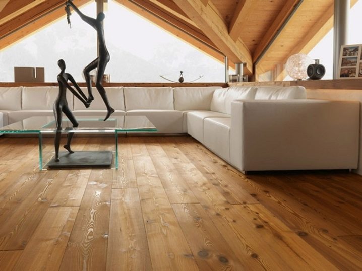 Aus ästhetischer Sicht fällt das Ensemble mit ausdrucksvollen Jahresringen auf. Aufgrund dieser Eigenschaft ist Lärchenparkett in verschiedenen dekorativen Richtungen weit verbreitet. Auch im Bereich der Herstellung von Holzfußböden mit gespleißter Lärchenplanke. Innovative Technologien und moderne Verarbeitungstechniken ermöglichen, dass Parkett dieser Sorte erfolgreich mit Produkten von seltenen und exotischen Arten konkurrieren kann.