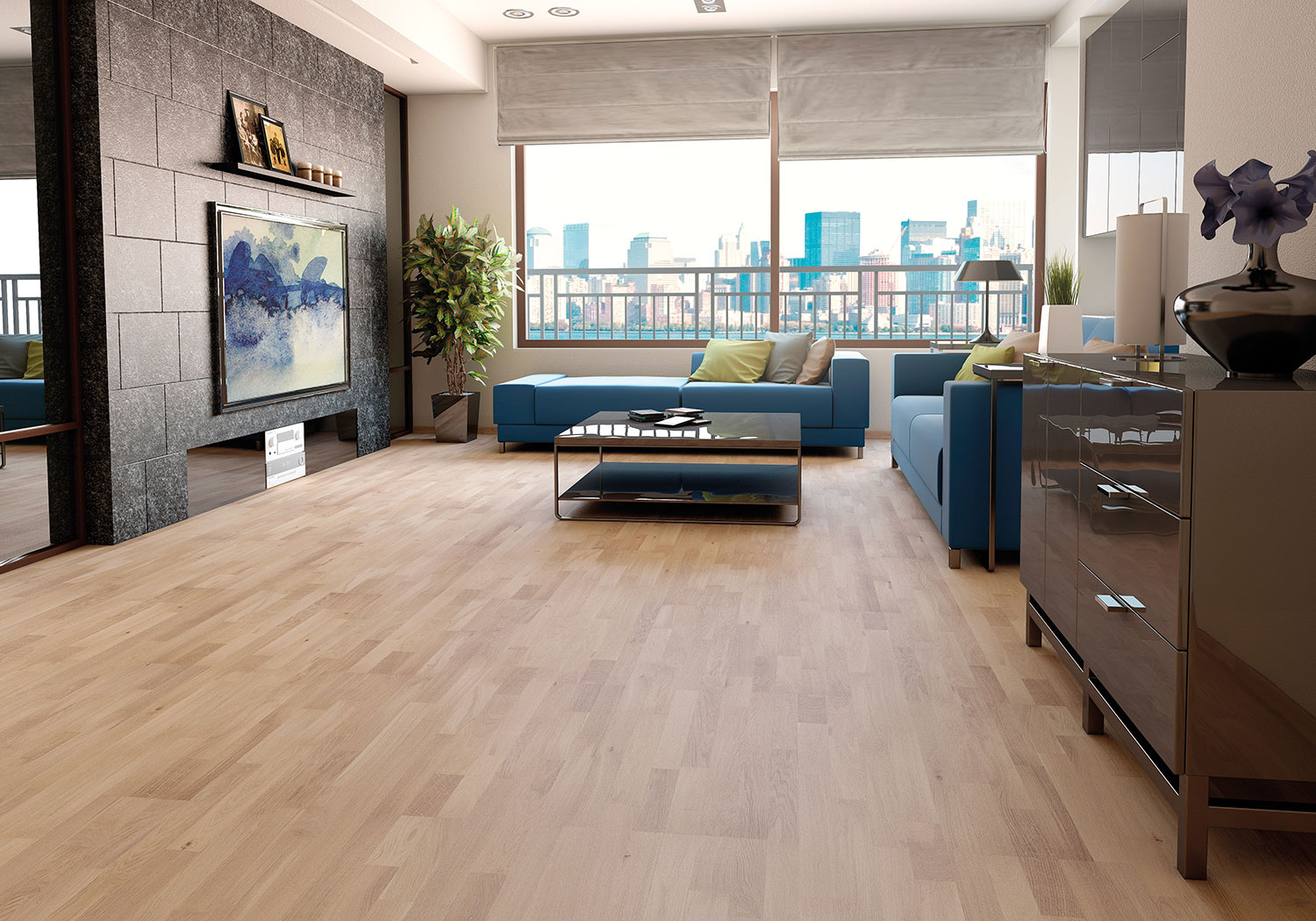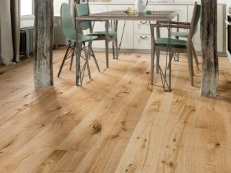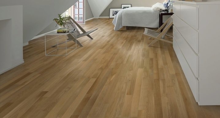Parkettboden sieht gut im Inneren des Esszimmers und Wohnzimmers aus, und um eine romantische Atmosphäre im Schlafzimmer zu schaffen, wählen Sie Eichenbretter mit hellen Farbtönen.