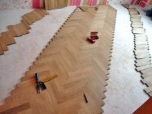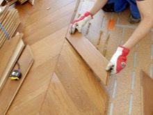 Beliebt ist Fischgrätparkett VerlegungDas sieht extrem stylish aus. Ein solches Muster auf dem Boden ermöglicht es Ihnen, den Raum optisch breiter zu machen. Kleine Lamellen werden oft sowohl in geräumigen als auch in kleinen Räumen verwendet. Sie sehen besser aus und erweitern den Raum.