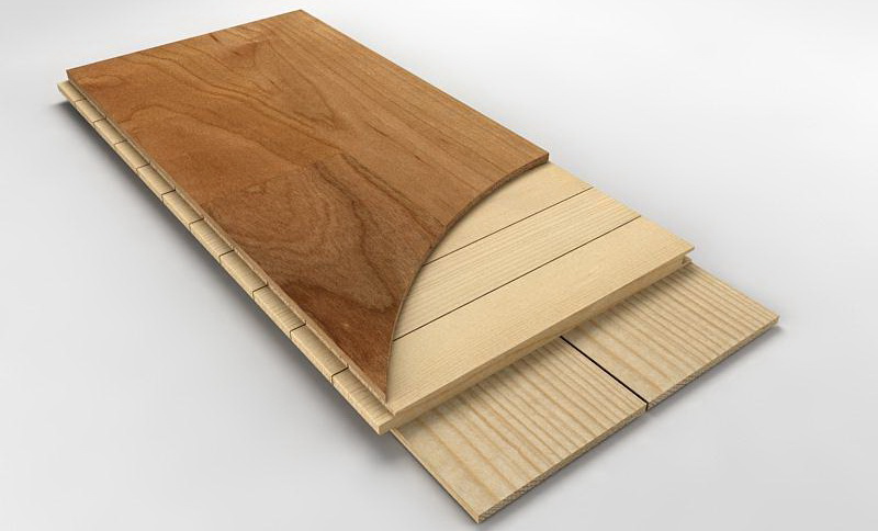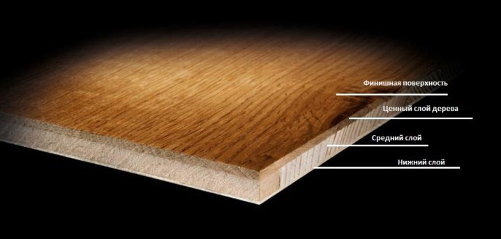 Dieses Material besteht aus mehreren Schichten, von denen die oberste dekorativ ist. Es ist aus Massivholz und bestimmt das Aussehen des Bodens. Die mittlere Schicht ist ein Harz-Holzfurnier. Es schützt den Boden vor Feuchtigkeit und macht die Beschichtung langlebiger. Auf der Unterseite der Diele - die Basis aus Sperrholz. Fichte oder Kiefernholz wird oft verwendet, um es zu machen.Die obere Schicht wird gewöhnlich mit einer Dicke von nicht mehr als 6 mm hergestellt, und im allgemeinen kann die Dicke der Bodenplatte sogar 20 mm erreichen.
