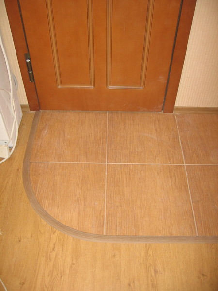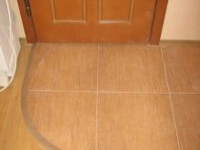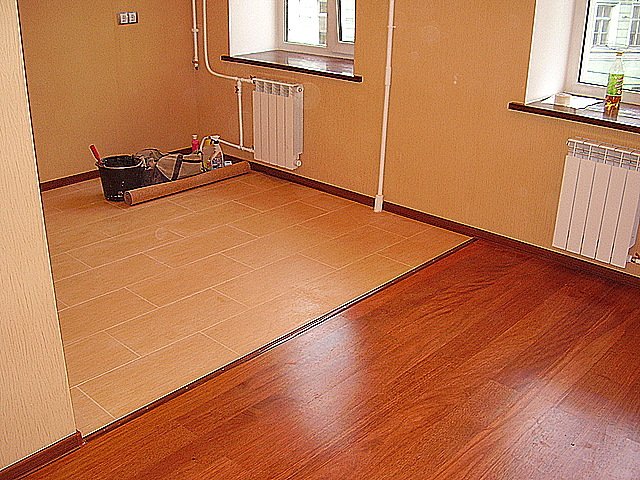 Leider toleriert die Bodenplatte keine Feuchtigkeit, und in einigen Räumen ist es notwendig, den Übergang zwischen der Platte und der Fliese oder anderen Baumaterialien zu schaffen. Meistens wird das Andocken im Korridor verwendet - vor der Eingangstür, zwischen dem Korridor und der Küche, zwischen dem Badezimmer und dem Korridor.