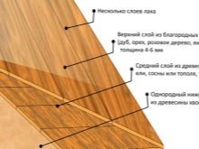 Die Dreischichtplatte besteht aus einer Stabilisierungsschicht, einer Basis und einer oberen Schicht. Die untere Schicht schützt das Produkt vor der Betonbasis. Es ist aus Fichtenfurnier gemacht. Zusätzlich verhindert es die Deformation der Platte.