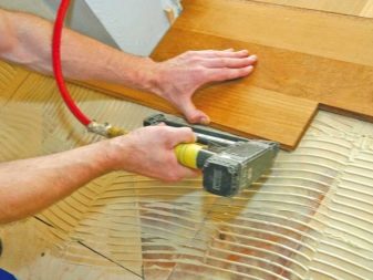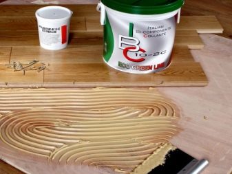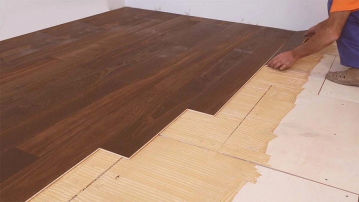 Die zweite Methode der Verlegung der Diele - auf dem Leim des Polyurethans.Wenn dies der Fall ist, sollte der Betonboden eingeebnet werden, die Oberfläche sollte getrocknet und trocken sein. Der Feuchtigkeitsparameter des Estrichs sollte drei Prozent nicht überschreiten. Auf dem Estrich passen spezielle Sperrholzplatten auf, die anschließend poliert werden.
