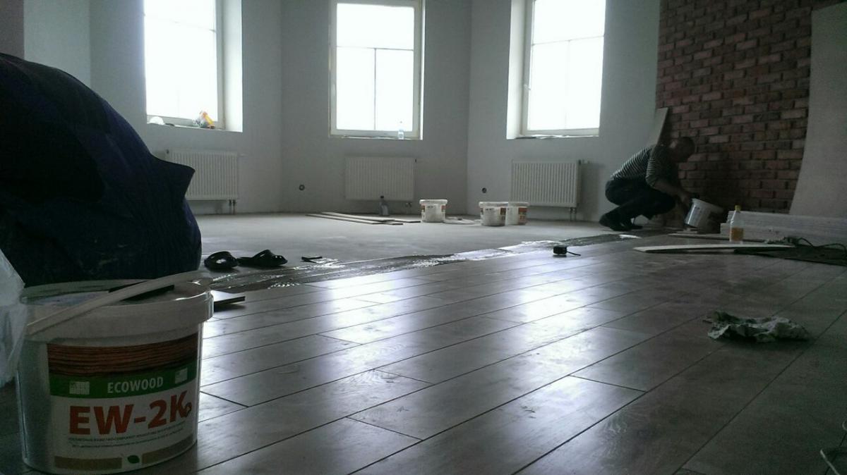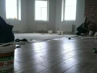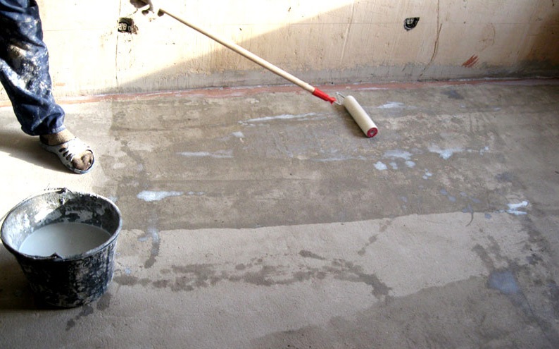 Als ein Beispiel wird das Klebeverfahren des Verlegens betrachtet. Bevor Sie mit dem Einbau der Diele beginnen, müssen Sie den Betonboden mit einer Acrylgrundierung behandeln. Die Überzugsschicht darf nicht zu dick sein. Nachdem die Grundierung die gesamte Oberfläche bedeckt hat, ist es notwendig zu warten, bis sie trocknet.