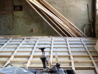 Entwurfholzboden angebracht auf einer konkreten Unterseite. Dazu werden Lags auf die vorbereitete Oberfläche gelegt.