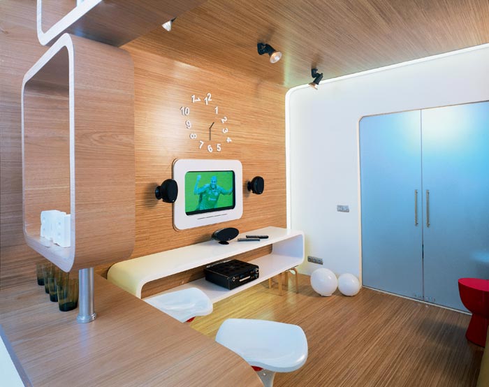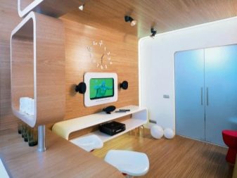 Das Befestigen von Parkett an der Wand und Decke ist ein weiterer neuer Trend. So wird die Einheit des Inneren erreicht, eine Art "Kasten" wird erhalten. Dieser Raum eignet sich für die Platzierung von akustischen Systemen - Heimkino, Musikzimmer und Projektor.