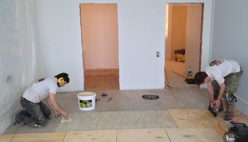 Ohne darauf zu warten, dass der Kleber trocknet, wird die Grundschicht in Form von Sperrholzplatten verlegt. Der Kleber sollte gleichmäßig in allen Bereichen aufgetragen werden, so dass das Sperrholz gleichmäßig verteilt ist - die Arbeit wird anhand der Konstruktionsebene überprüft. Sperrholz passt in jeder Hinsicht, es gibt keinen Unterschied in diesem, am wichtigsten, vergessen Sie nicht, die Nähte mit Acryldichtmittel zu reiben. Nach zwei Tagen wird die Arbeit wieder mit einem Niveau überprüft, und wenn die Installation qualitativ durchgeführt wird, ist es notwendig, das Ergebnis zu fixieren - die Oberfläche zu schleifen.