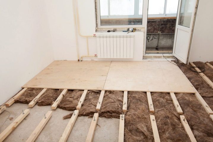 Die Isolierung passt zwischen die Lags, um mit ihnen bündig zu seinEs sollte keine Projektionen geben. Sperrholz wird über diese Struktur gelegt. Wenn das Budget begrenzt ist, kann Sperrholz durch eine Bodenplatte ersetzt werden.