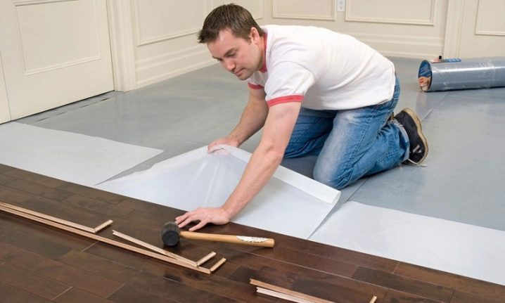 In Zukunft müssen Sie die Estrichabdichtungsfolie auftragen. Alle Lücken werden sorgfältig mit normalem Klebeband aufgeklebt. Als Schalldämmung können Sie ein natürliches Material verwenden - Korkholz oder das zuvor erwähnte geschäumte Polyethylen. Ohne diese Schicht besteht eine hohe Wahrscheinlichkeit von Geräuschen beim Gehen.
