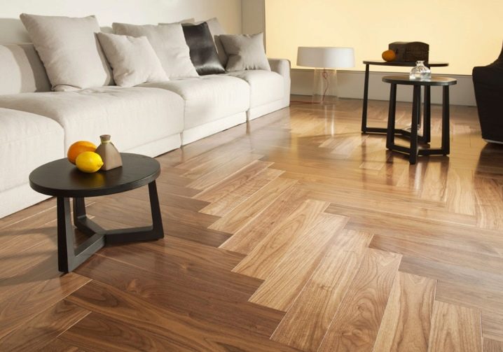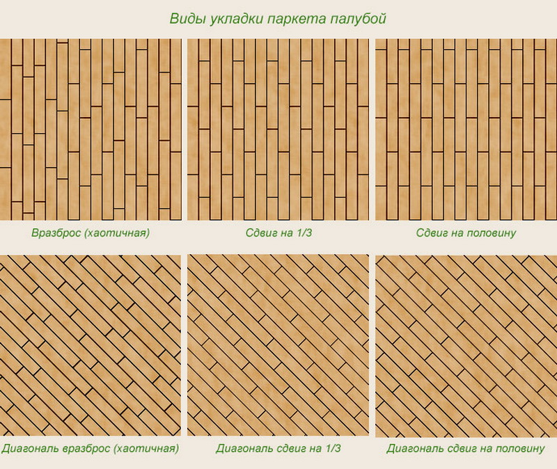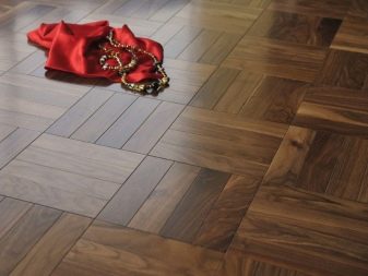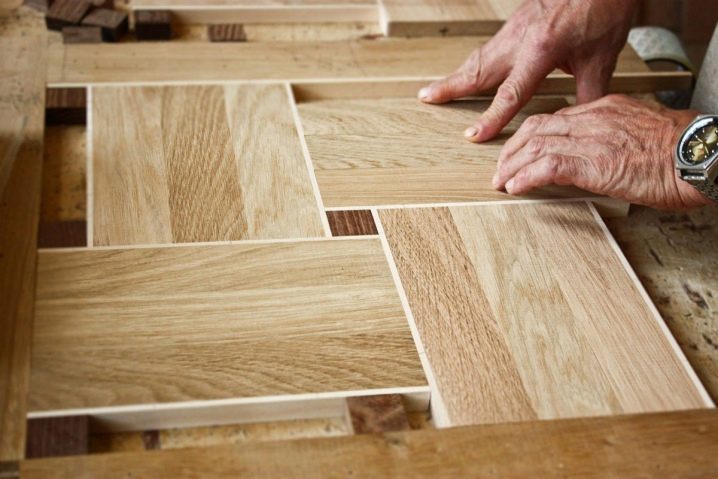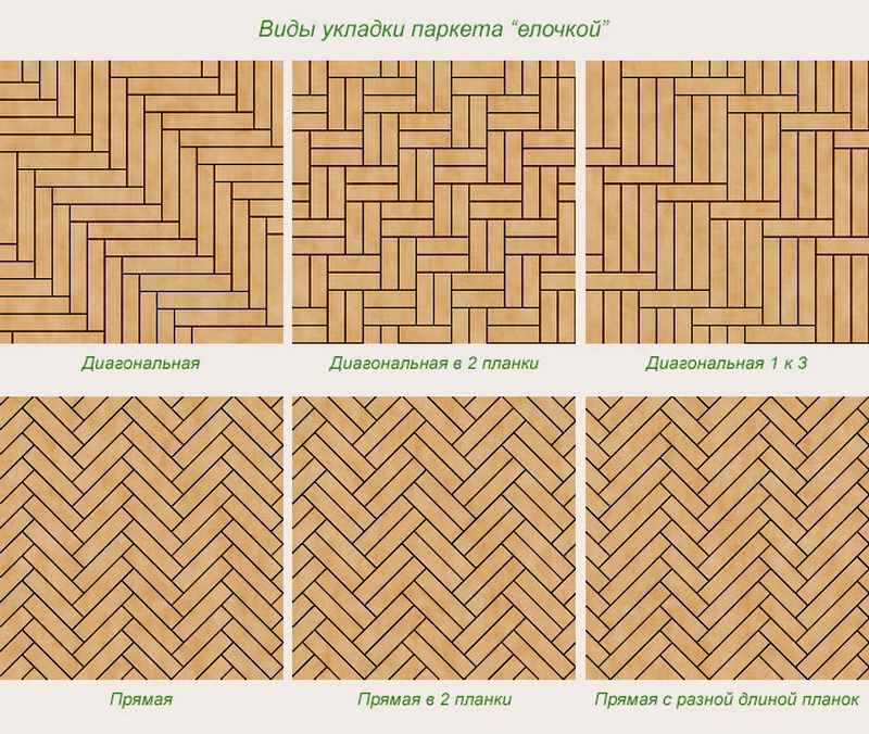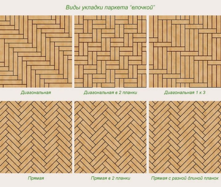Das Parkett besteht aus zwei Schichten - einem quadratischen Schild aus Brettern oder Faserplatten und kleinen Brettern aus Hartholz. Das Hauptbild ist ein Quadrat oder seine Ableitungen.