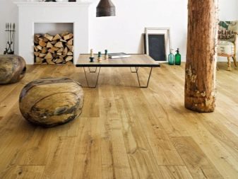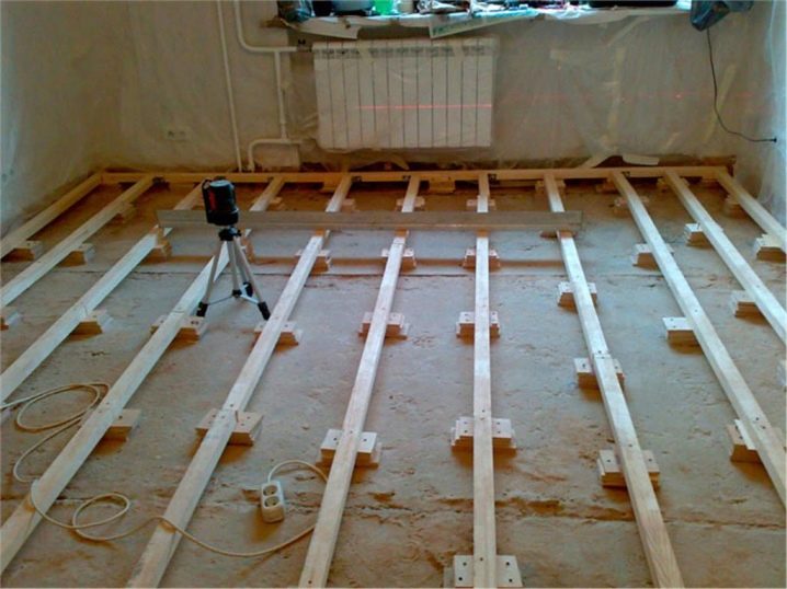 Die nächste Art von Basis - Boden auf Holzstämmen. Ein wasserabweisender Film schleicht sich auf den Beton, danach werden die Stämme (Balken 50x50 oder 50x80 cm) mit einer Stufe von 35-40 cm verlegt und mit Winkeln und Dübeln verbunden. Als nächstes müssen Sie den Bodenbelag aus Sperrholz verlegen. Für die Verbindung sind Schrauben genommen. Parkett kann auf einem Holzboden liegen. Um dies zu tun, ist es notwendig, die Beschichtung auf Quietschen, Dips und andere Defekte zu überprüfen, erst nachdem der Boden poliert ist.