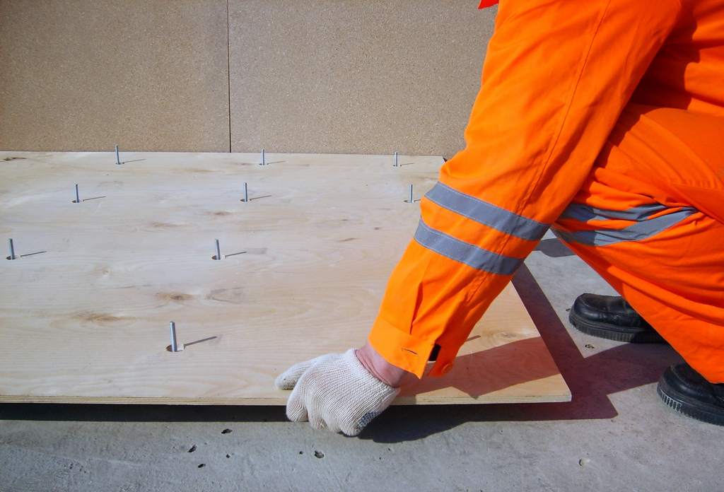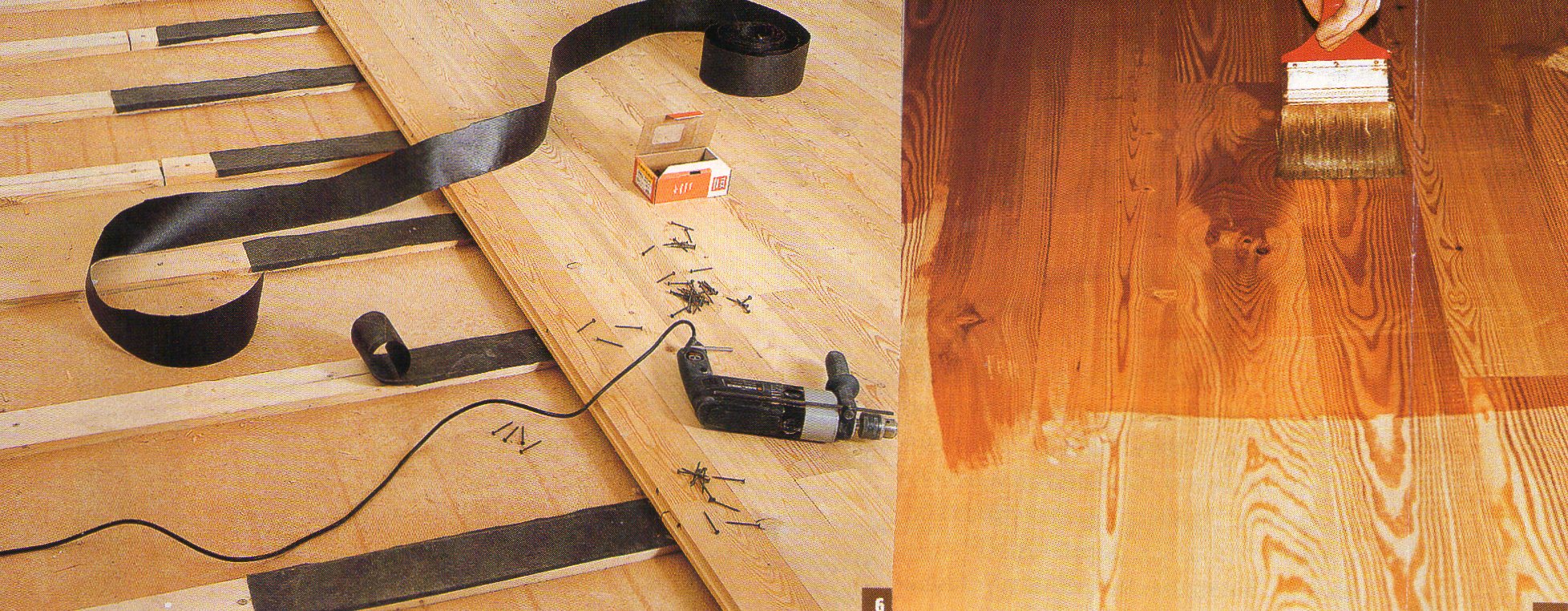 Nach dem Trocknen wird der Estrich mit einer Grundierung versehen und mit mindestens 12 mm dickem Sperrholz abgedeckt. Die Sperrholzplatten werden in Quadrate von 75x75 cm geschnitten, um das Parkett vor der Schrumpfung zu schützen und um die Bretter zu verbinden.