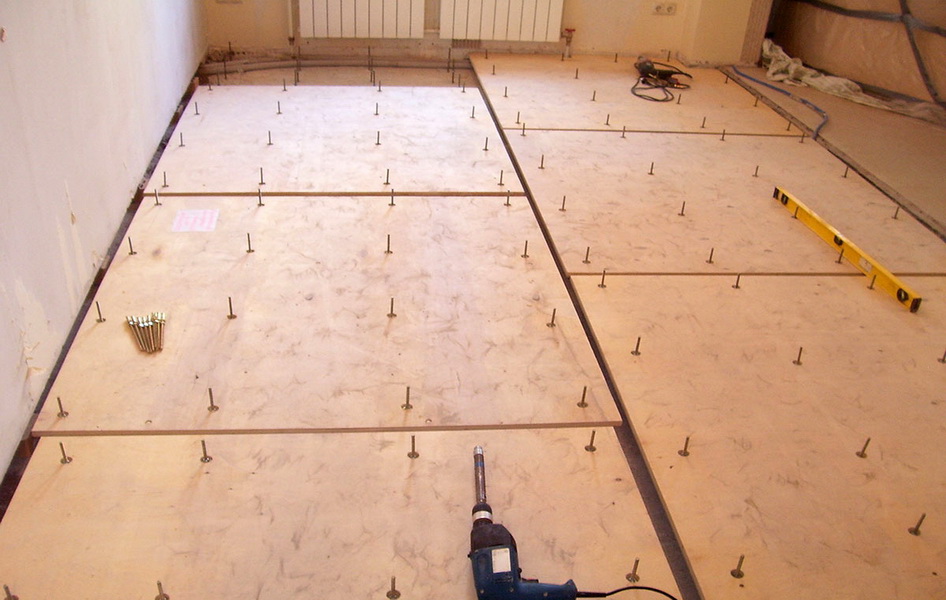 Wenn der Boden Beton istEs muss wasserdicht sein, dh mit einer speziellen Diffusionsmembran oder Folie abgedeckt sein. Das Andocken der Membran erfolgt mit einer Überlappung von 20 cm und wird mit Konstruktionsband fixiert. An den Wänden der Membrane führen bis zu 15 cm und Klebeband befestigt. Als nächstes wird der Boden mit einer selbstnivellierenden Mischung mit einer Dicke von nicht mehr als 5 cm gegossen.Dies ist die Basis für wasserfestes Sperrholz.