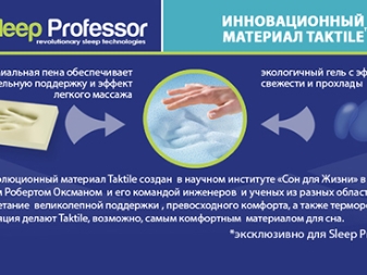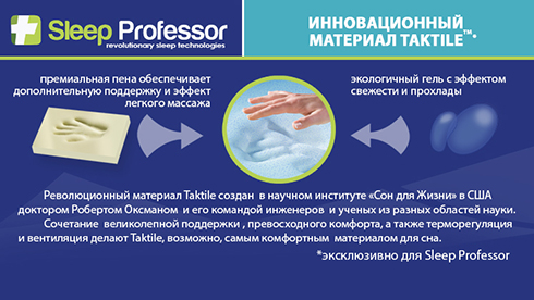- Taktil. Dieses Material besteht aus Mikropartikeln des Gels. Es bietet einen unübertroffenen Wärmeaustausch, sodass es sich auch im heißen Sommer nicht im Schlaf aufwärmt, Kopf und Nacken nicht schwitzt und Sie sich wohl fühlen.
