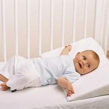 - Geneigte Kissen unterschiedliche Form der Kopfstütze. Diese Produkte sind von Geburt an erlaubt. Sie helfen dem Baby bei der Fütterung, die verschluckte Luft loszuwerden, was die Bildung von Koliken verhindert.