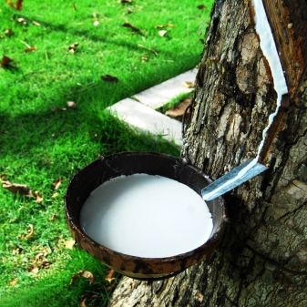 Sammeln Sie dieses Rohmaterial von Hand mit speziellen Schalen. Das Volumen von einem Baum beträgt bis zu 100 Gramm für 1 Sammlung. Saft verändert seine Struktur ziemlich schnell (etwa 4 Stunden), so dass er innerhalb weniger Stunden unmittelbar nach seiner Herstellung zu Gummi oder Latexschaum wird.