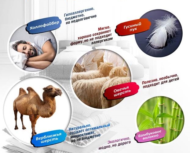 - Wolle von Kamelen und Schafen hält sich gut warm und hat auch eine heilende Wirkung.Es ist weich, gut belüftet und kann Feuchtigkeit optimal aufnehmen und verdunsten. Der Nachteil dieses Füllstoffs ist seine Fähigkeit, Allergien zu verursachen, Zerbrechlichkeit (im Laufe der Zeit fällt die Wolle in Klumpen), das Risiko von Motten und Mikroorganismen. Das Produkt nicht waschen